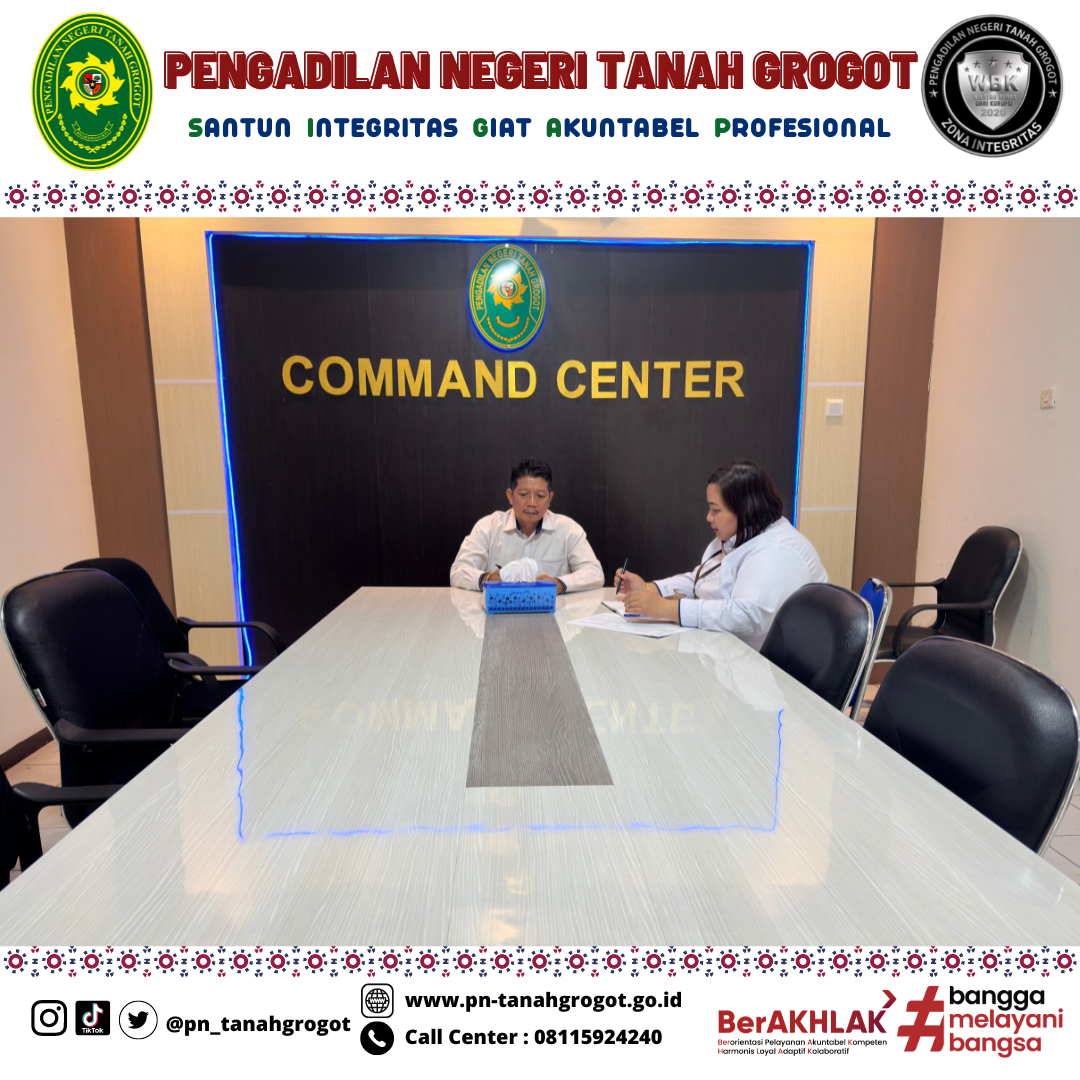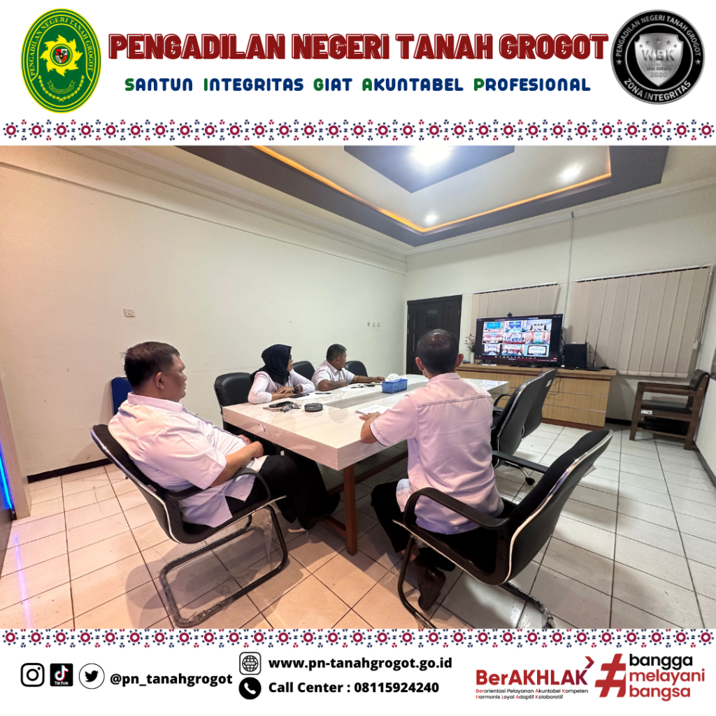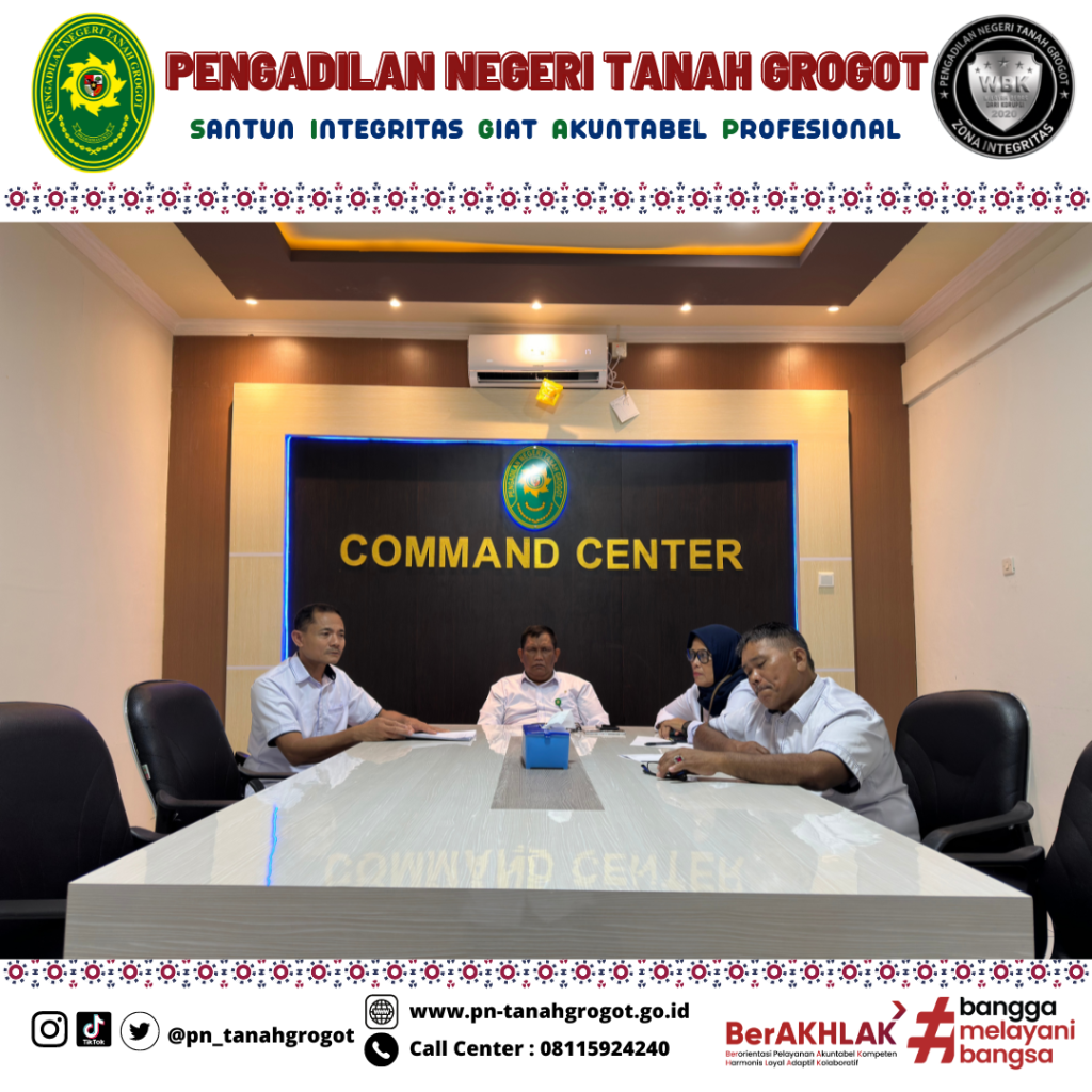 Bertempat di Ruang Command Center Pengadilan Negeri Tanah Grogot, Kepaniteraan Pengadilan Negeri Tanah Grogot mengikuti kegiatan monitoring dan evaluasi bagian kepaniteraan oleh Pengadilan Tinggi Kalimantan Timur secara virtual. Kegiatan ini dihadiri oleh Bapak Khalid, S.H. selaku Panitera Pengadilan Negeri Tanah Grogot, dan Para Panitera Muda yang berada di bawah Kepaniteraan Pengadilan Negeri Tanah Grogot.