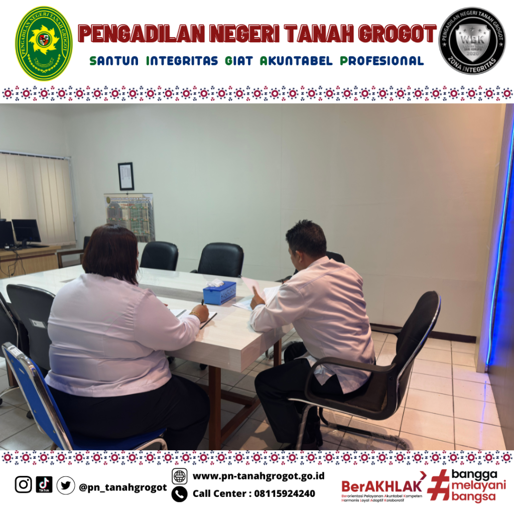 Kemudian acara berlanjut ke kegiatan monitoring dan evaluasi bagian kesekretariatan oleh Pengadilan Tinggi Kalimantan Timur. Kegiatan ini dihadiri oleh Bapak Sugianto, S.H. selaku Sekretaris Pengadilan Negeri Tanah Grogot beserta dengan Para Kasubbag yang berada di bawah Kesekretariatan Pengadilan Negeri Tanah Grogot.