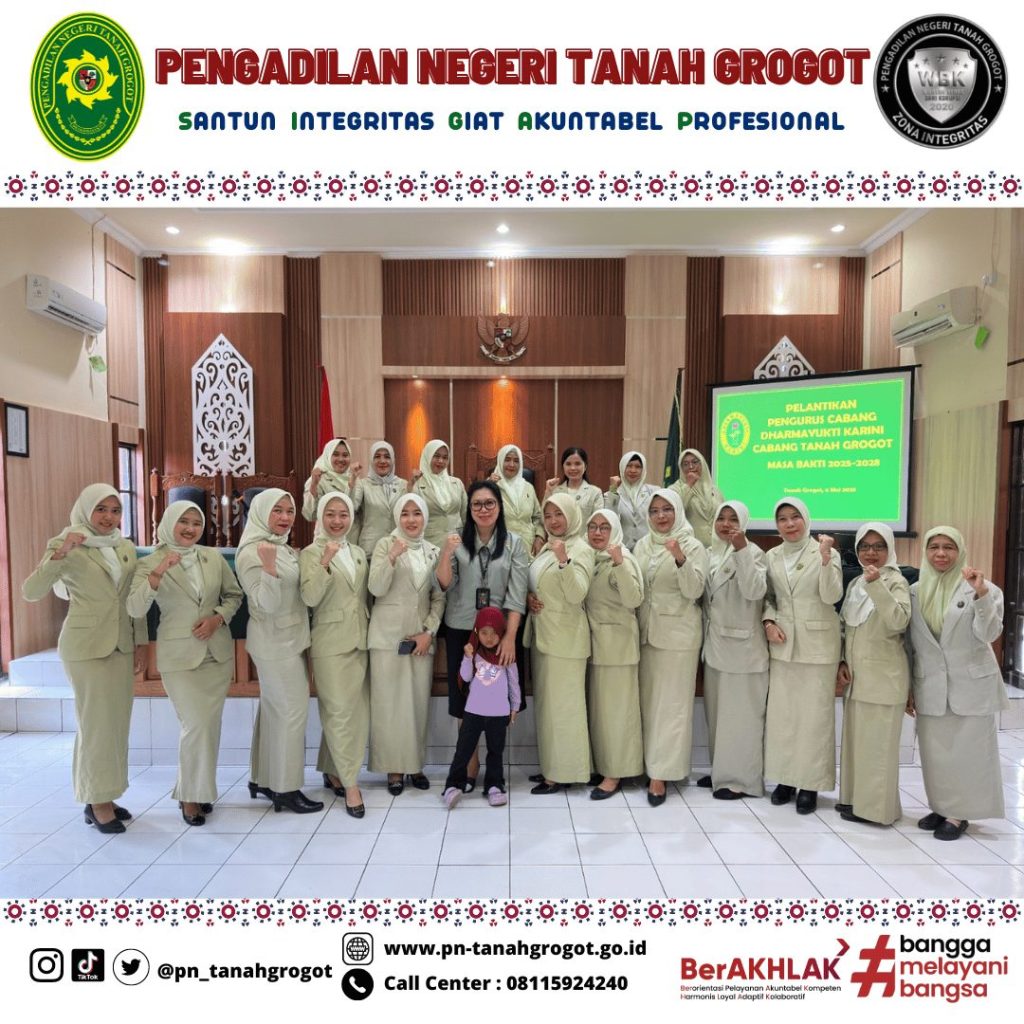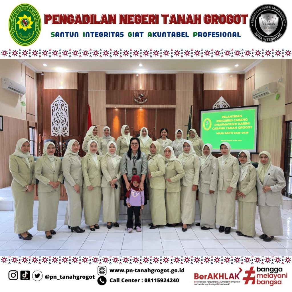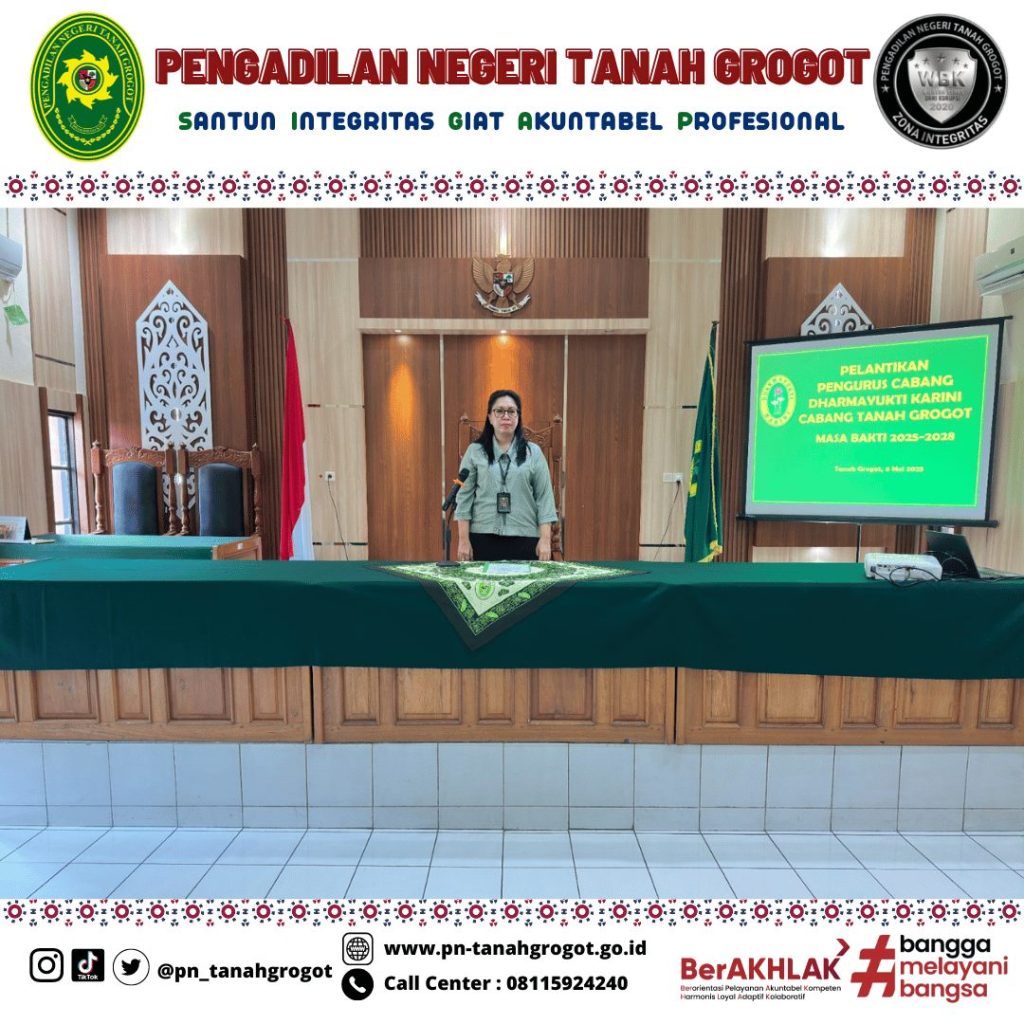 Pada hari Selasa tanggal 6 Mei 2025 pukul 08.30 WITA Ketua Pengadilan Negeri Tanah Grogot Ibu Ari Listyawati, S.H., M.H. selaku Pelindung Dharmayukti Karini Cabang Tanah Grogot telah melantik Pengurus Cabang Tanah Grogot masa bakti 2025-2028.