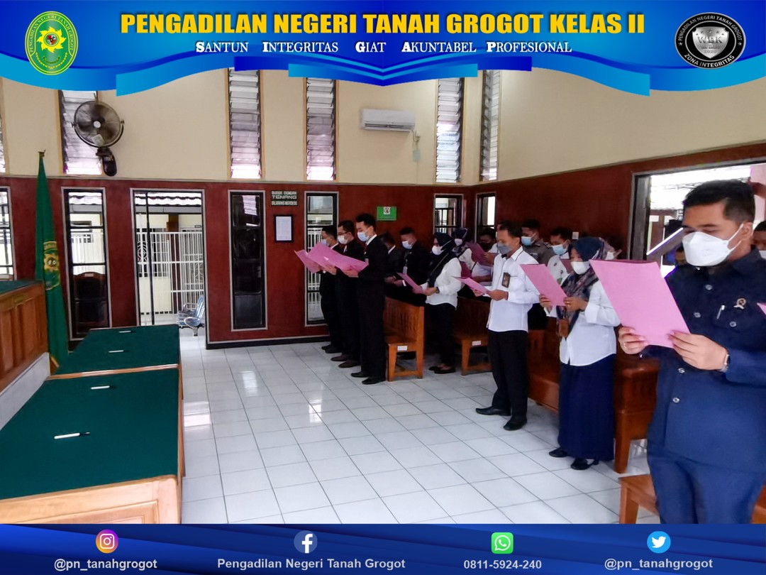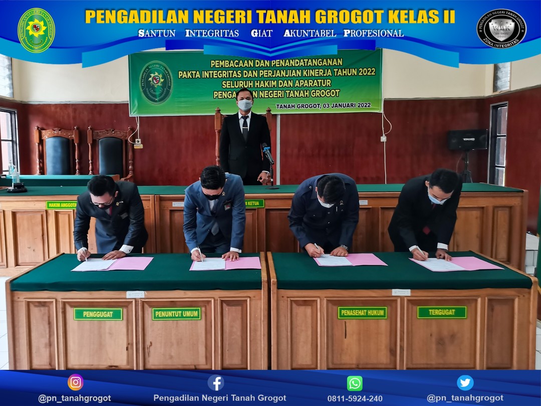 Pengadilan Negeri Tanah Grogot Kelas II menyelenggarakan Acara Penandatanganan Pakta Integritas tahun 2022. Acara di pimpin oleh Ketua Pengadilan Negeri Tanah Grogot Kelas II, Bpk. Made Adicandra, S.H.