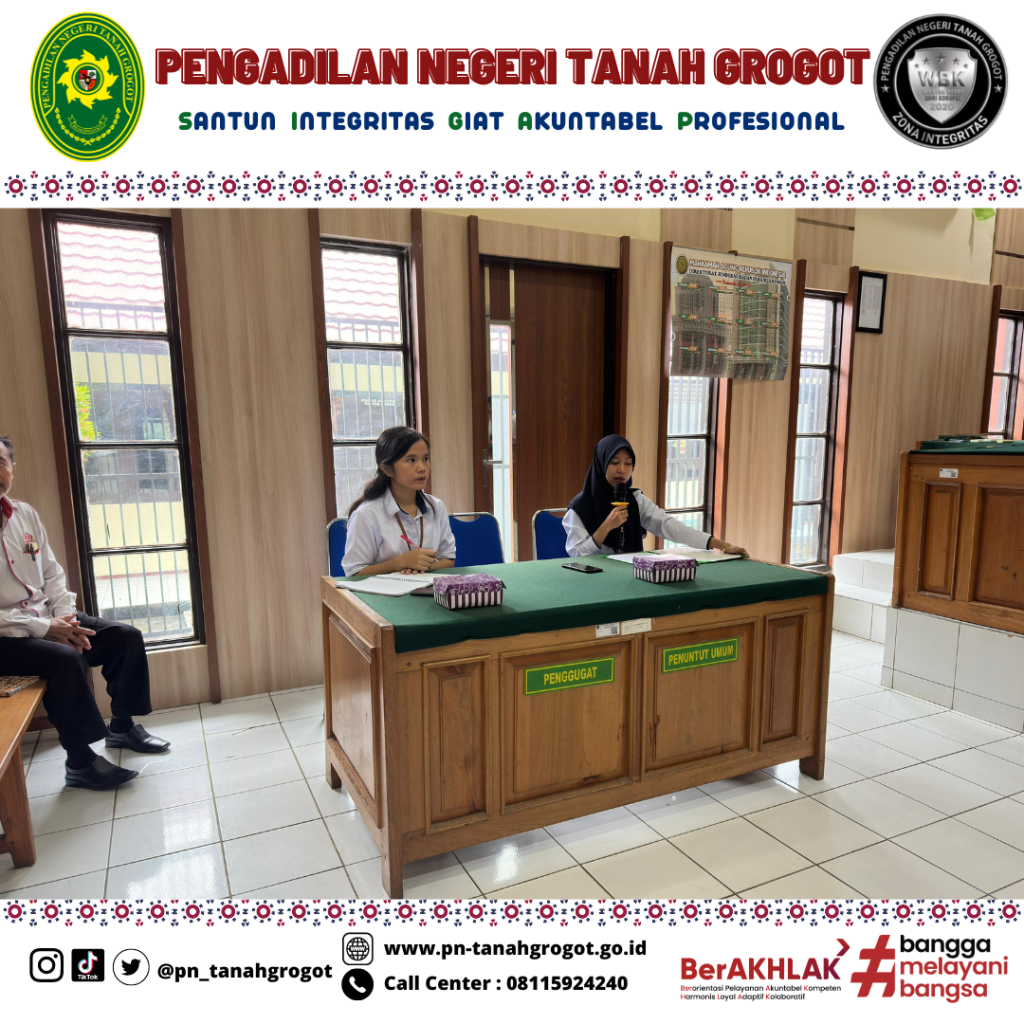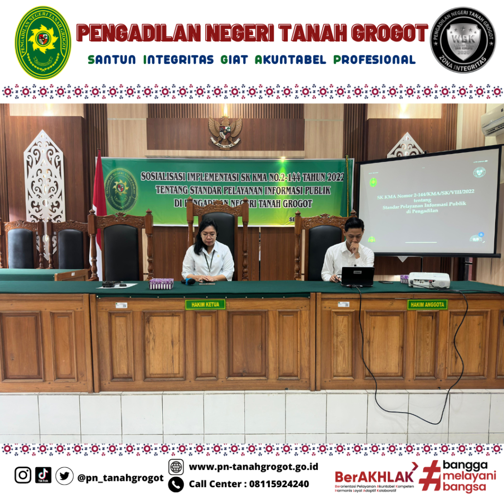 Bertempat di Ruang Sidang Utama Pengadilan Negeri Tanah Grogot, telah diadakan Sosialisasi Standar Pelayanan Informasi Publik di Pengadilan oleh Hakim Pengadilan Negeri Tanah Grogot, Bapak Romi Hardhika, S.H. Acara sosialisasi ini dihadiri oleh Perwakilan dari Badan Pusat Statistik Kabupaten Paser dan Perwakilan Advokat di Kabupaten Paser. Sosialisasi ini bertujuan untuk memperkenalkan SK KMA 2-144/KMA/SK/VIII/2022 dari Mahkamah Agung Republik Indonesia tentang Standar Pelayanan Informasi Publik di Pengadilan.